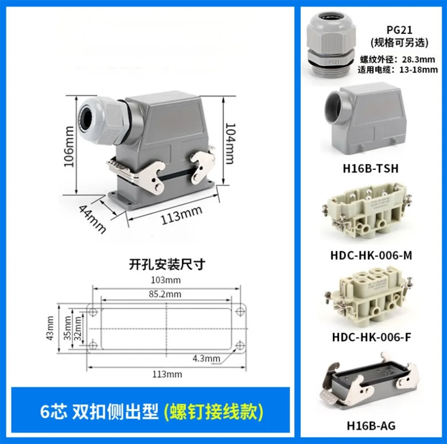 80A Ο σύνδεσμος βαρέως τύπου ένθετου 4+2 ακίδων είναι επεξεργασμένος από αλουμίνιο H16B-TSH Περίβλημα του συνδετήρα βαρέως τύπου. Είναι κατασκευασμένο από υλικό PC αντοχής και ορείχαλκο επάργυρο. Οι ορειχάλκινες καρφίτσες CHTAR είναι επενδυμένες με ασήμι καλής ποιότητας και καλύτερης ηλεκτρικής αγωγιμότητας. Περιέχει λάστιχο στεγανοποίησης για να το κάνει καλό αδιάβροχο χαρακτηριστικό.