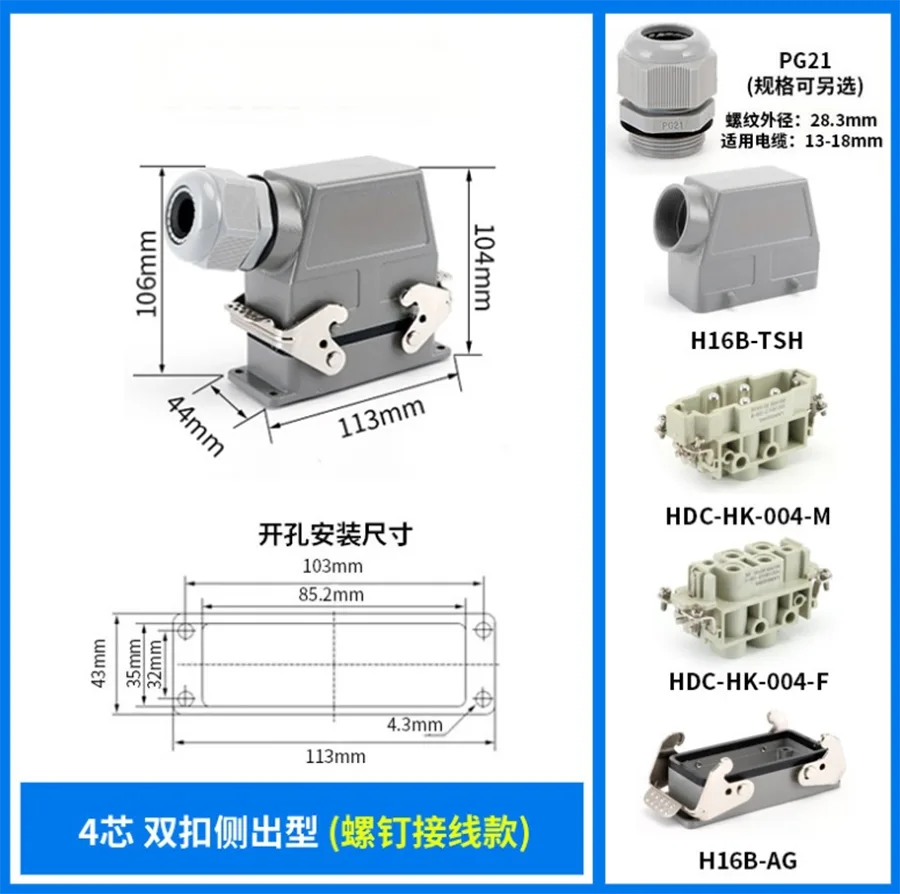 Οι σύνδεσμοι HK-004/0-M HK Heavy duty λειτουργούν κάτω από ρεύμα 80A. Είναι 4 ακίδες για επαφή με καλώδια. Προσφέρεται για διαφορετικές συνθήκες εργασίας και χρησιμοποιείται σε αυτόματες βιομηχανίες και είδη σύνδεσης καλωδίωσης μηχανών.