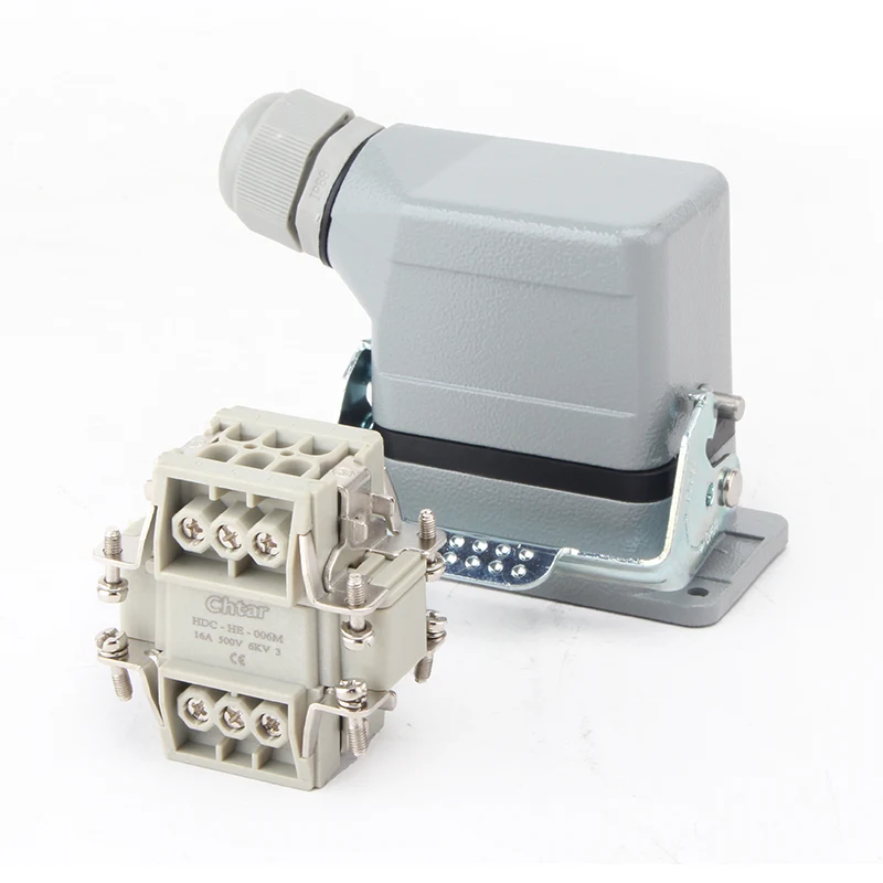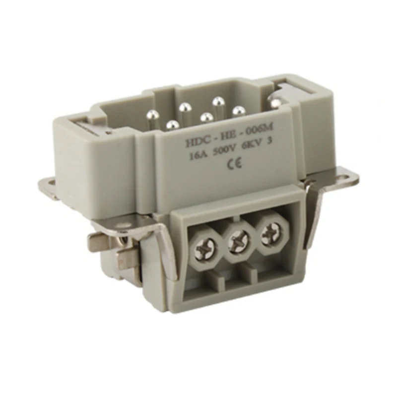 Οι σύνδεσμοι βαρέως τύπου Insert M/F 6 ακίδων λειτουργούν κάτω από ρεύμα 16A. Είναι 16 ακίδες για επαφή με καλώδια. Προσφέρεται για διαφορετικές συνθήκες εργασίας και χρησιμοποιείται σε αυτόματες βιομηχανίες και είδη σύνδεσης καλωδίωσης μηχανών.