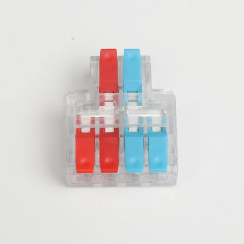 CHTAR Οι μικροί σύνδεσμοι συρμάτων συρμάτων δύο σε τέσσερις εξόδους είναι κατασκευασμένοι από πολυανθρακικό κέλυφος και μοχλούς νάιλον. Και τα δύο πλαστικά υλικά είναι υλικό ποιότητας UL94 V0. Τα μεταλλικά εξαρτήματα είναι αγώγιμα και ελατηριώνουν μέσα σε αυτό που είναι κατασκευασμένο από χαλκό T2 με επικασσιτερωμένο και ελατήριο S301.