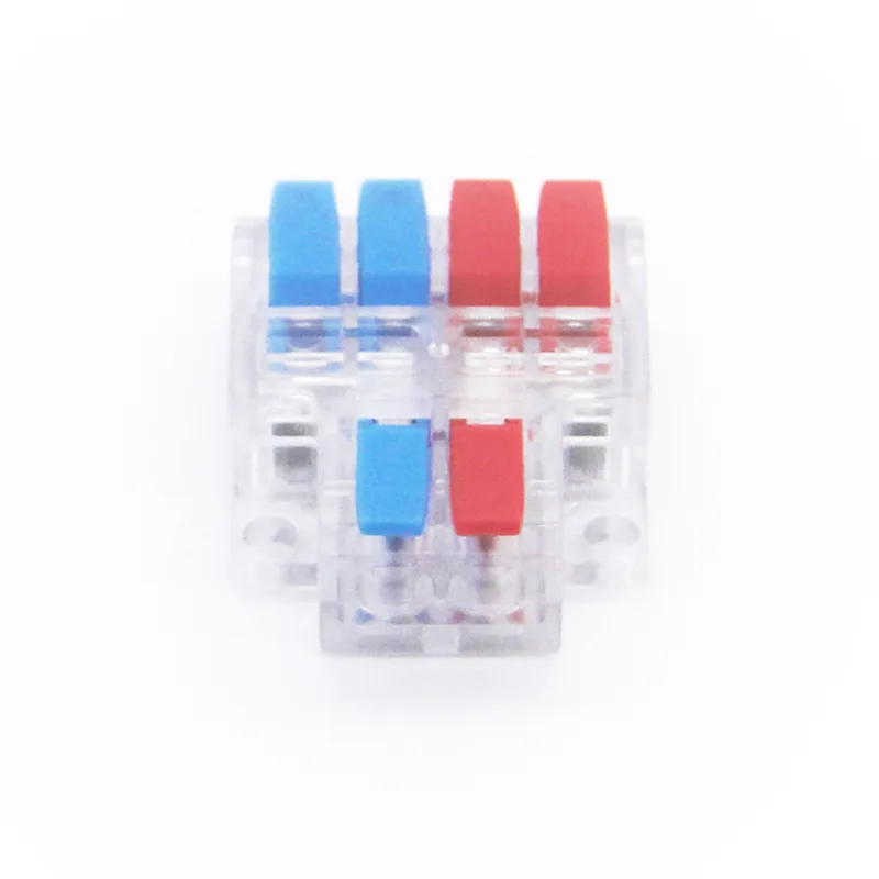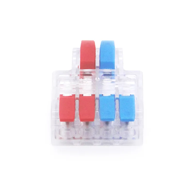 CHTAR Οι γρήγοροι σύνδεσμοι συρμάτων δύο σε τέσσερις εξόδους είναι κατασκευασμένοι από πολυανθρακικό κέλυφος και μοχλούς νάιλον. Και τα δύο πλαστικά υλικά είναι υλικό ποιότητας UL94 V0. Τα μεταλλικά εξαρτήματα είναι αγώγιμα και ελατηριώνουν μέσα σε αυτό που είναι κατασκευασμένο από χαλκό T2 με επικασσιτερωμένο και ελατήριο S301.